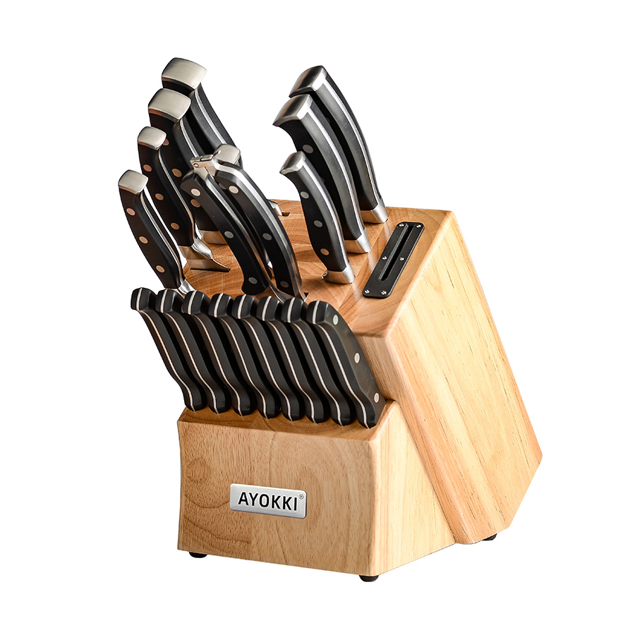 AYO-AH01 18PCS ABS handle kitchen knife set with natural rubber wooden block