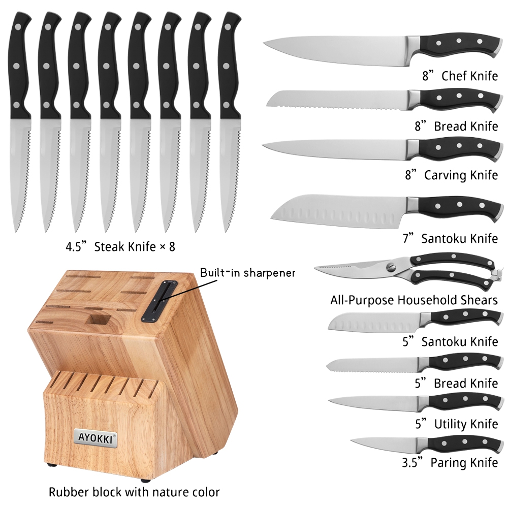 Block knife set include:8”Chef knife, 8″Slicer knife, 8″Bread knife, 7“Santoku knife, 5″Santoku knife, 5″Bread knife, 5″Utility knife, 3.5″Paring knife, 4.5“ steak knife, kitchen shear, bulit-in Sharpener, natural wooden block