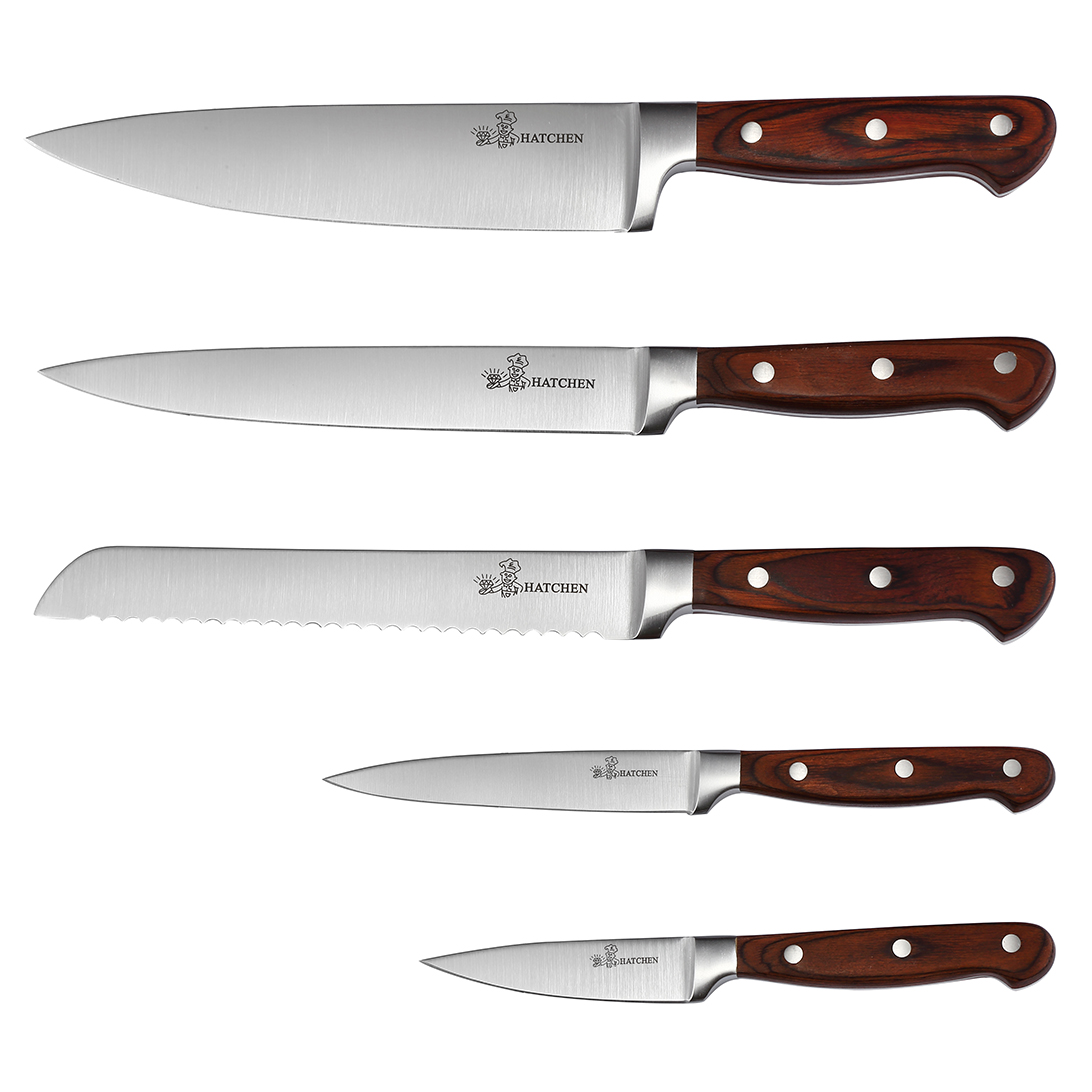 Block knife set include:8”Chef knife, 8″Slicer knife, 8″Bread knife, 5″Utility knife, 3.5″Paring knife, Brown wooden block