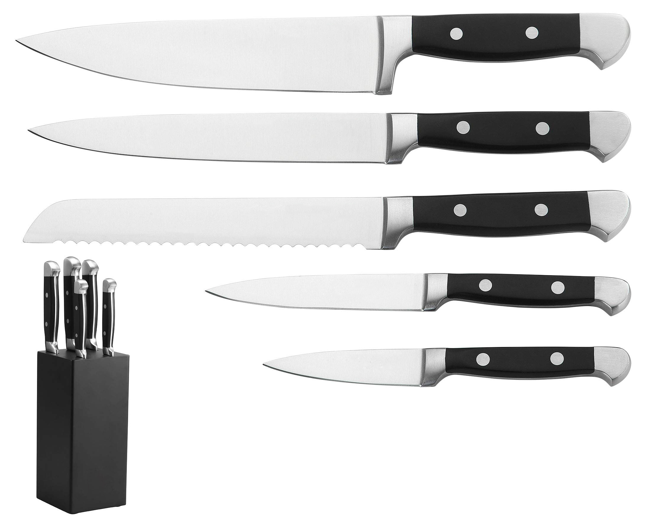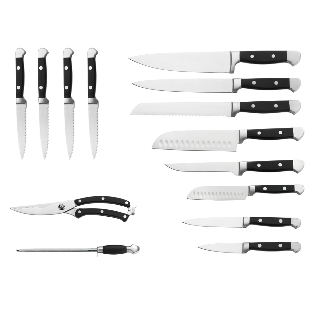 Kitchen knives include :8“Chef knife, 8″Slicer knife, 8”Bread knife,7″Santoku knife,6″Boning knife, 5”Utility knife, 3.5”Paring knife,4 pcs 4.5″Steak knives.