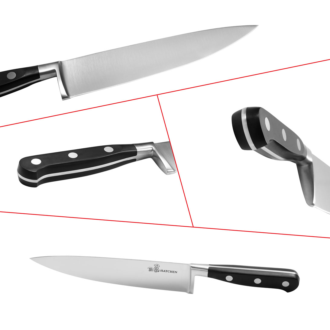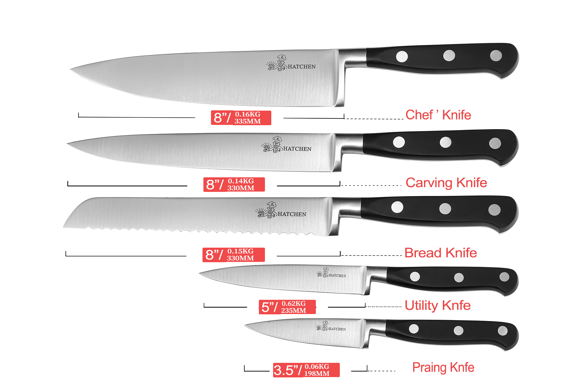 5 pieces kitchen knife set include :8“Chef knife, 8″Slicer knife, 8”Bread knife, 5”Utility knife, 3.5”Paring knife