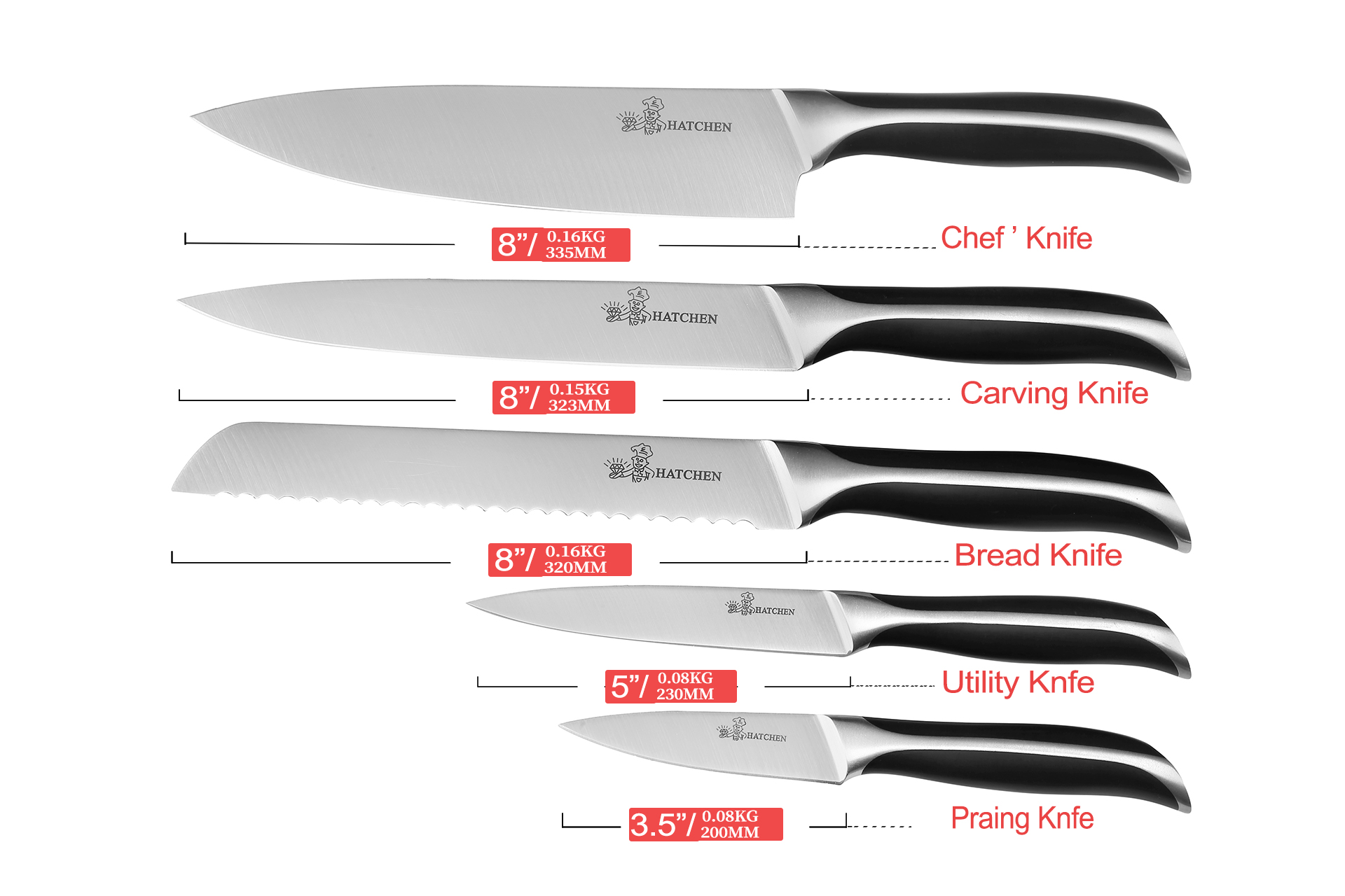 5 pieces kitchen knife set include :8“Chef knife, 8″Slicer knife, 8”Bread knife, 5”Utility knife, 3.5”Paring knife