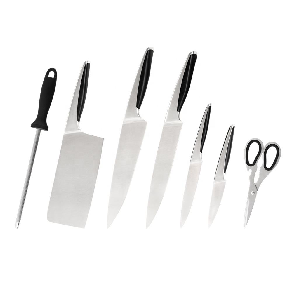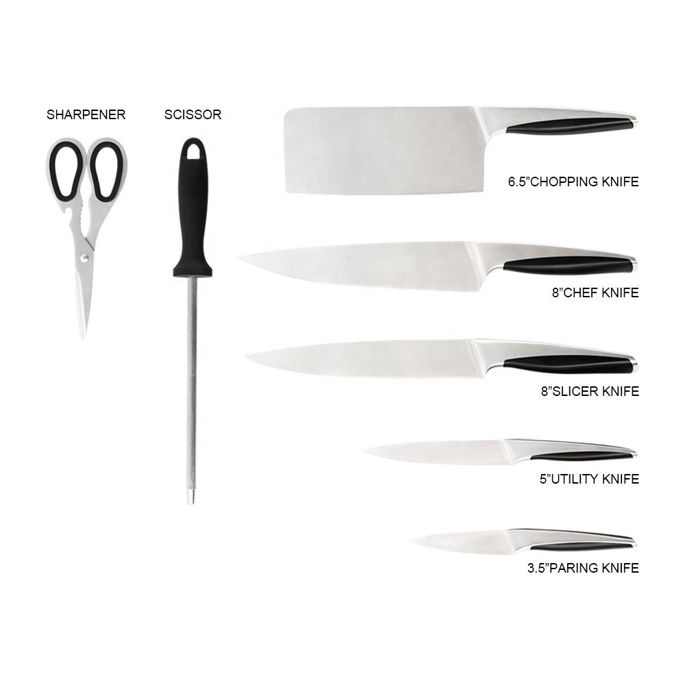 8 pieces kitchen knife set include :8“Chef knife, 8″Slicer knife, 7”cleaver knife, 5”Utility knife, 3.5”Paring knife,honing stick,scissors,knife stand