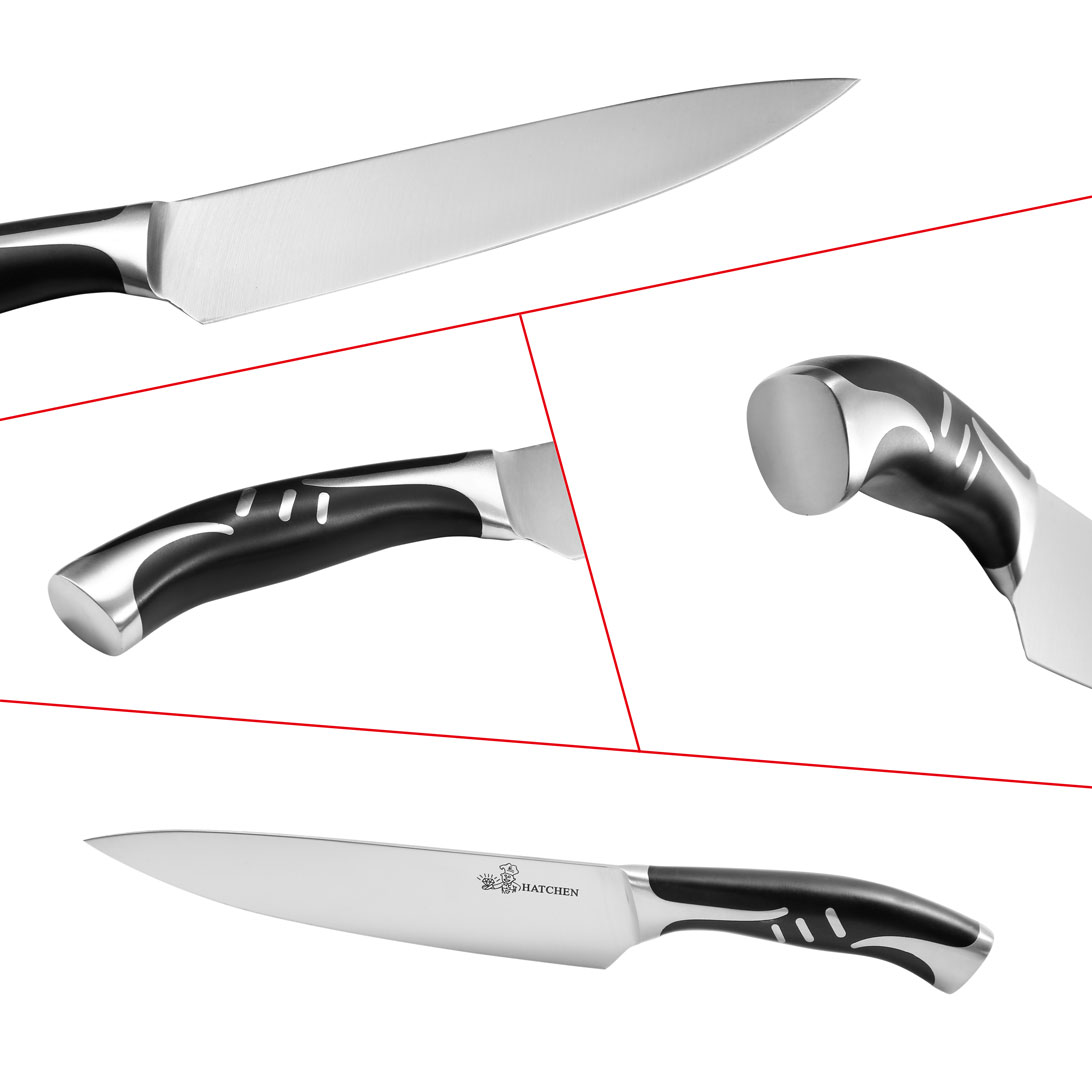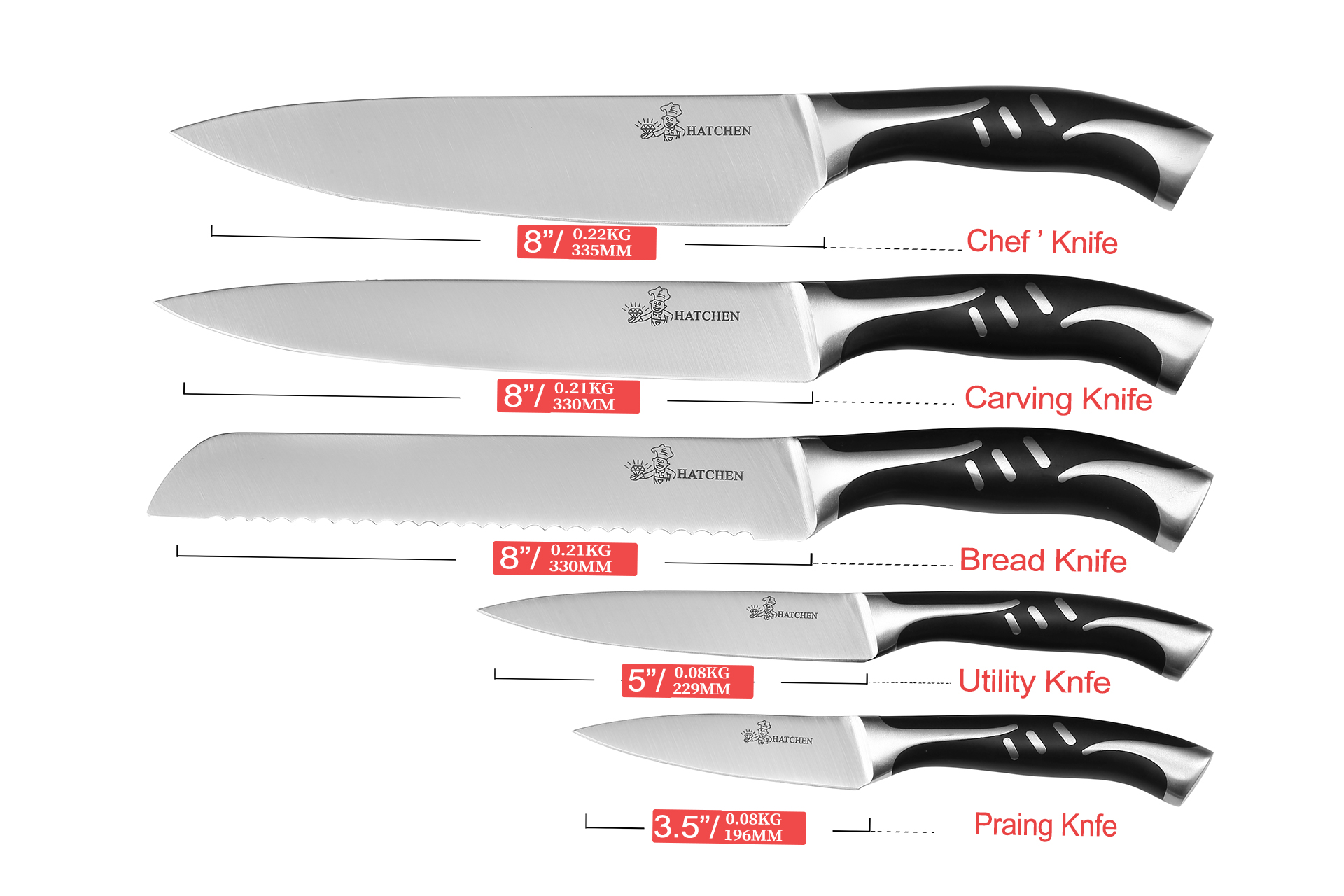 5 pieces kitchen knife set include :8“Chef knife, 8″Slicer knife, 8”Bread knife, 5”Utility knife, 3.5”Paring knife