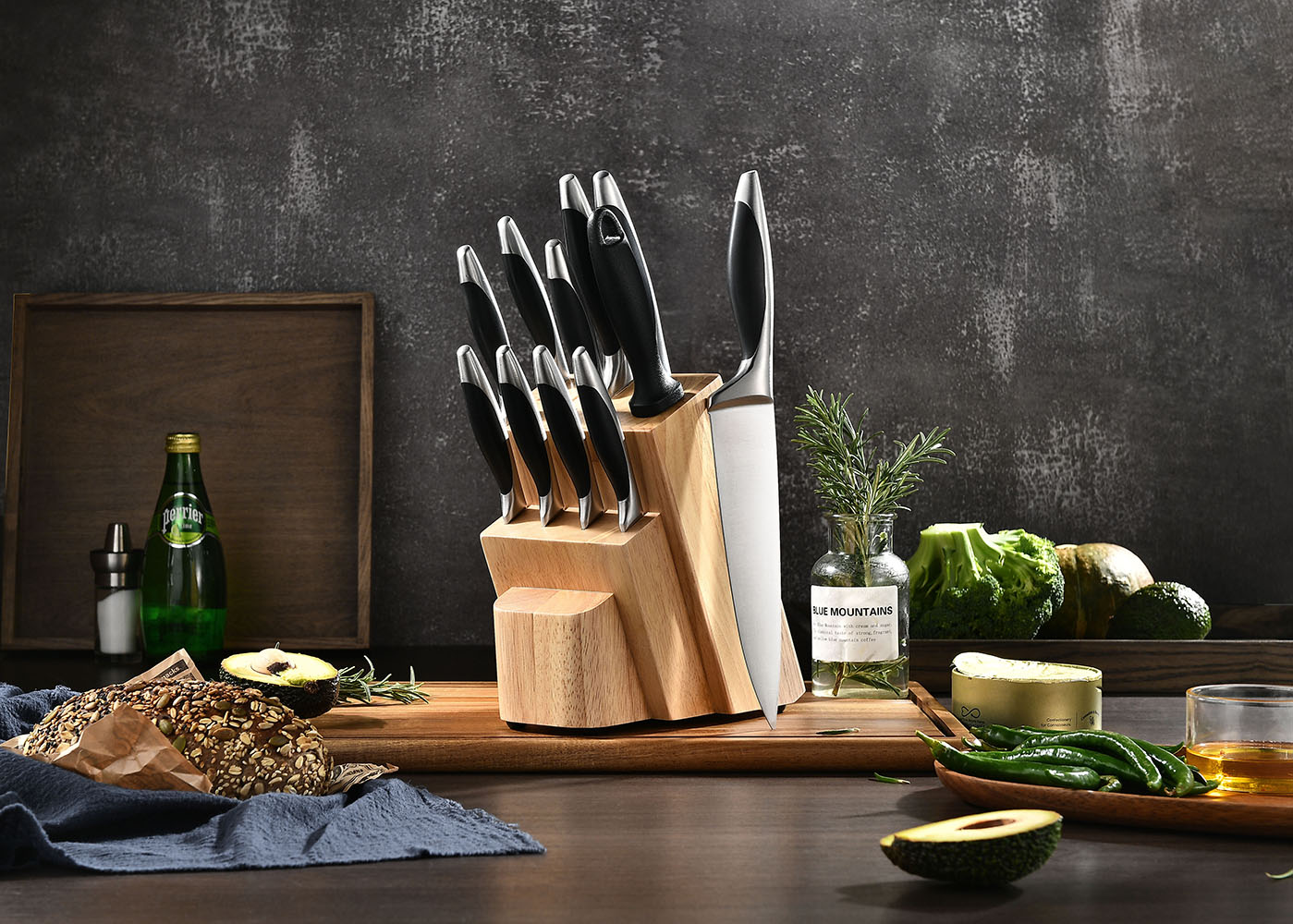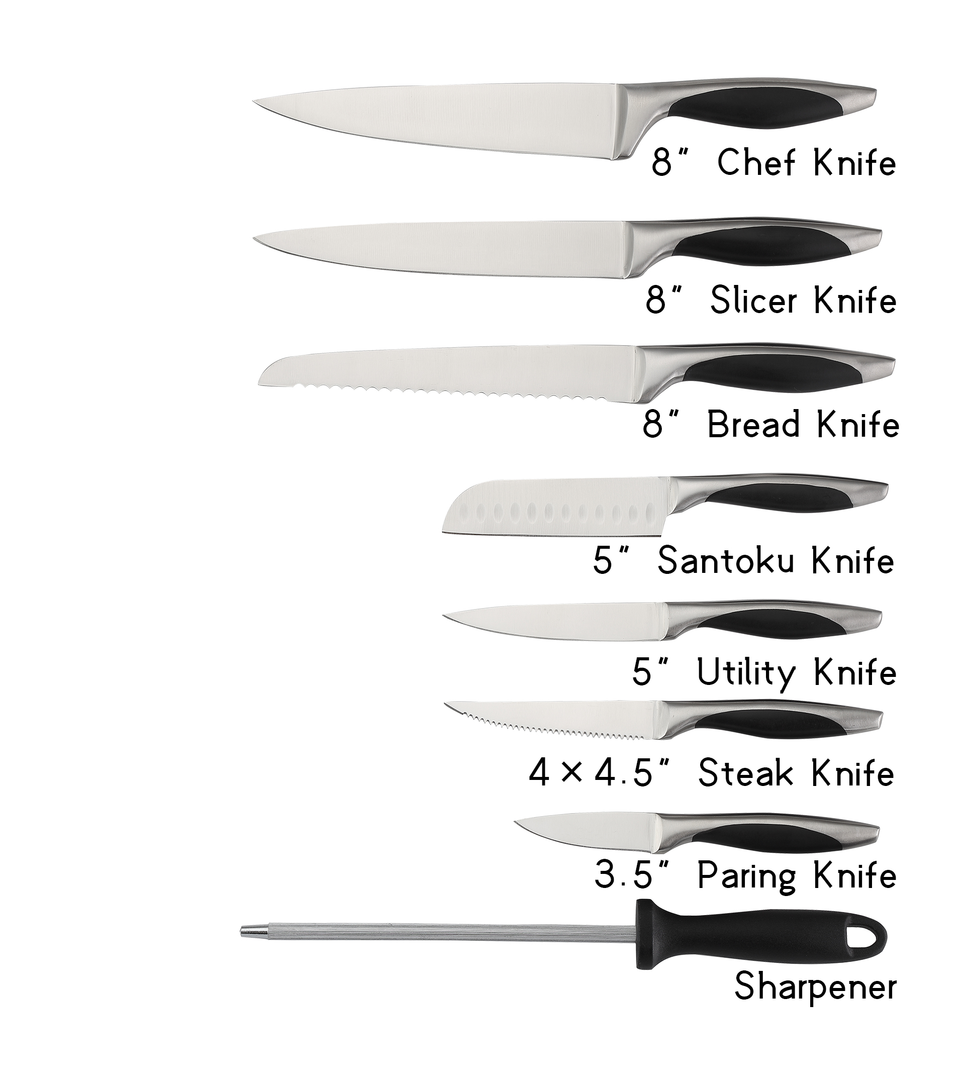 Block knife set include:8”Chef knife, 8″Slicer knife, 8″Bread knife, 5”Santoku knife, 5″Utility knife, 3.5″Paring knife, Natural wooden block