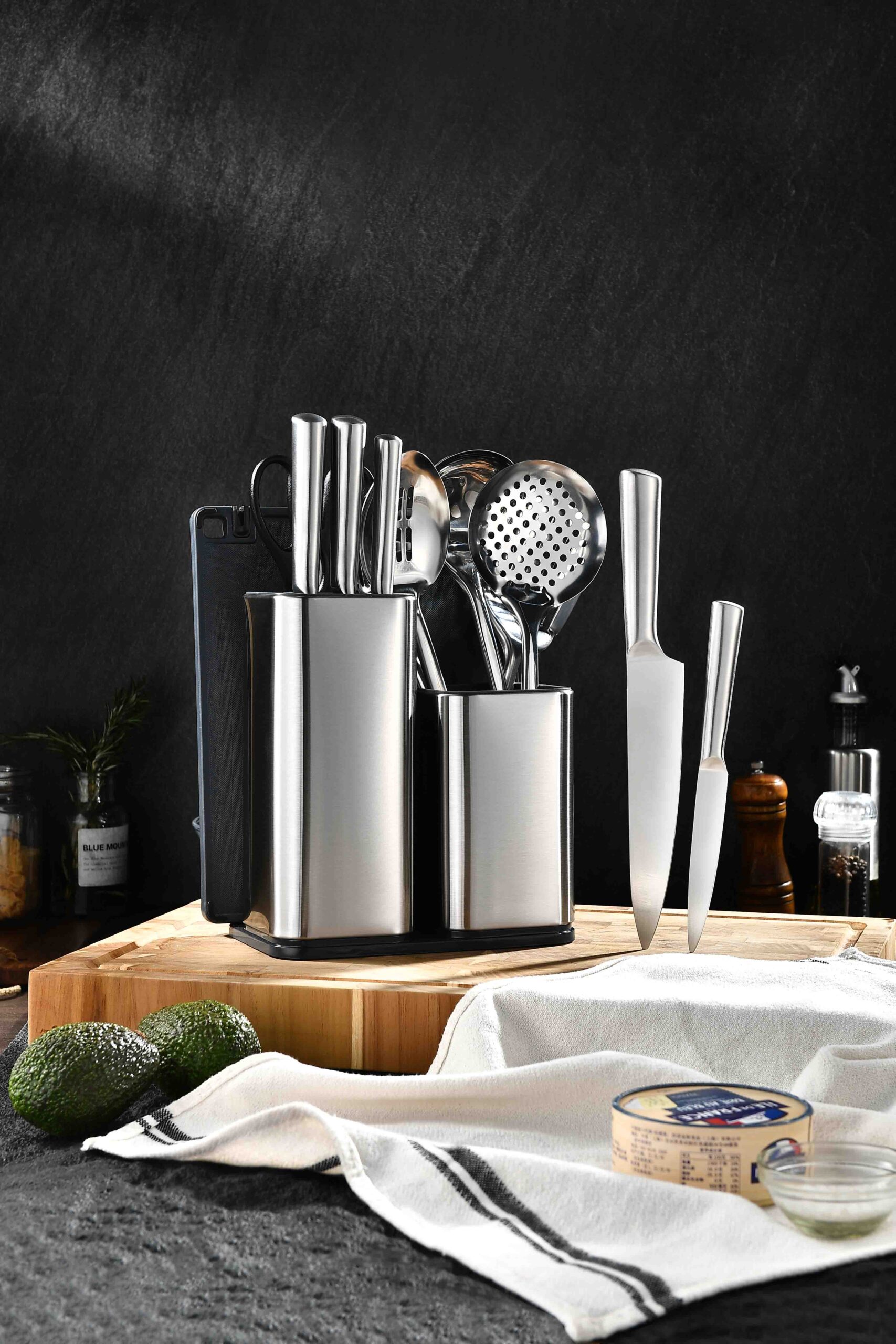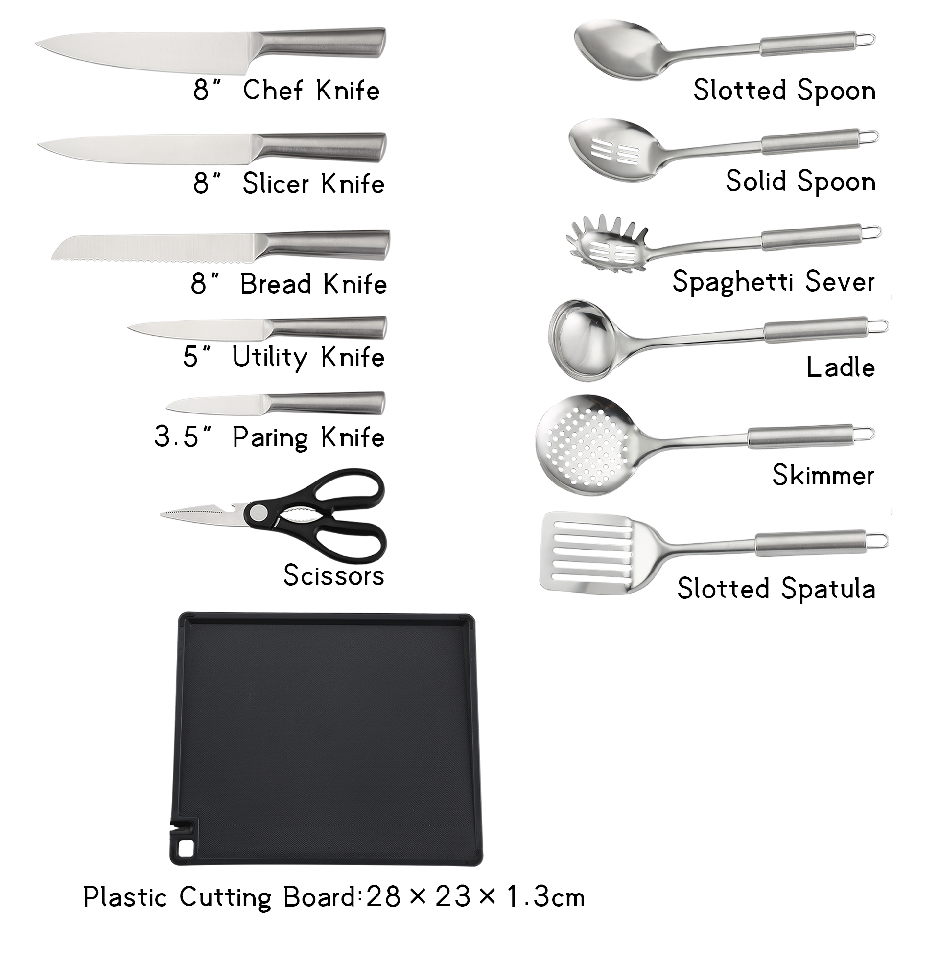 Block knife set include:8”Chef knife, 8″Slicer knife, 8″Bread knife, 5″Utility knife, 3.5″Paring knife, stainless steel holders, and six pieces kitchen utenils