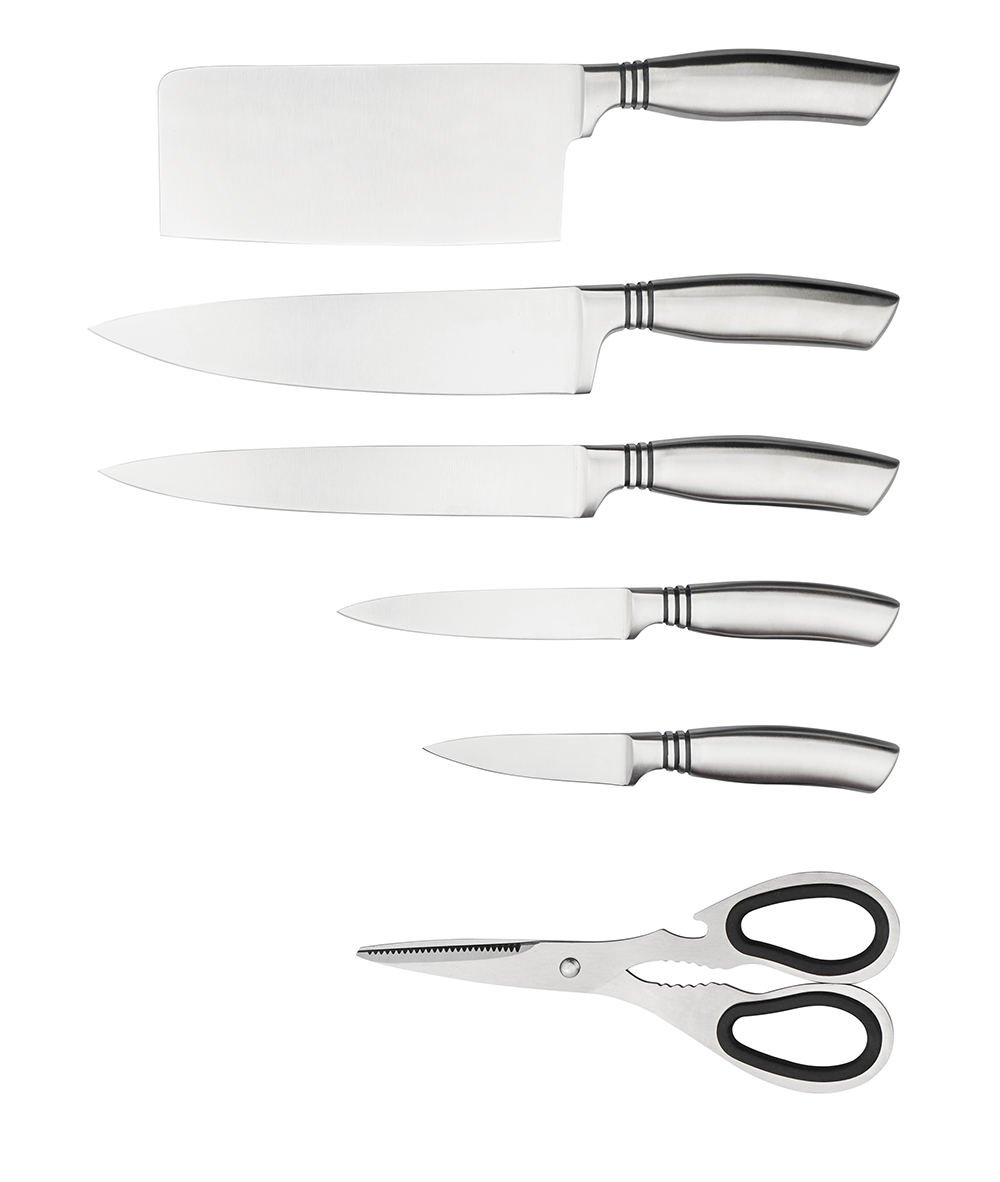 7 pieces kitchen knife set include :8“Chef knife, 8″Slicer knife, 8”Bread knife, 5”Utility knife, 3.5”Paring knife,Kitchen scissors ,plastic knife block