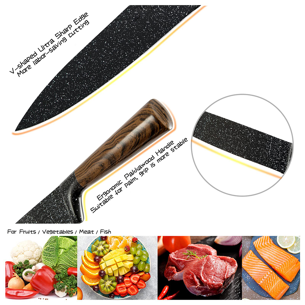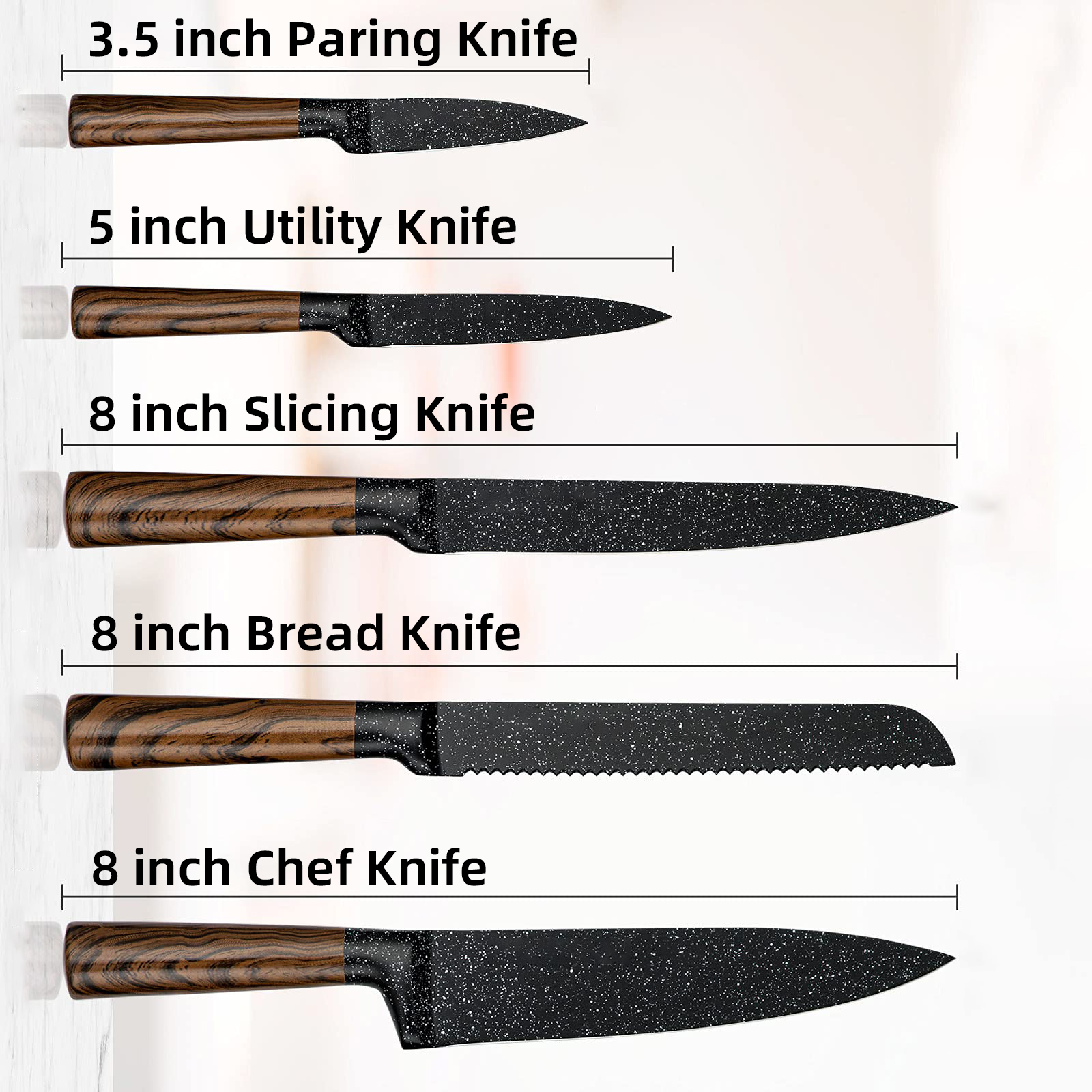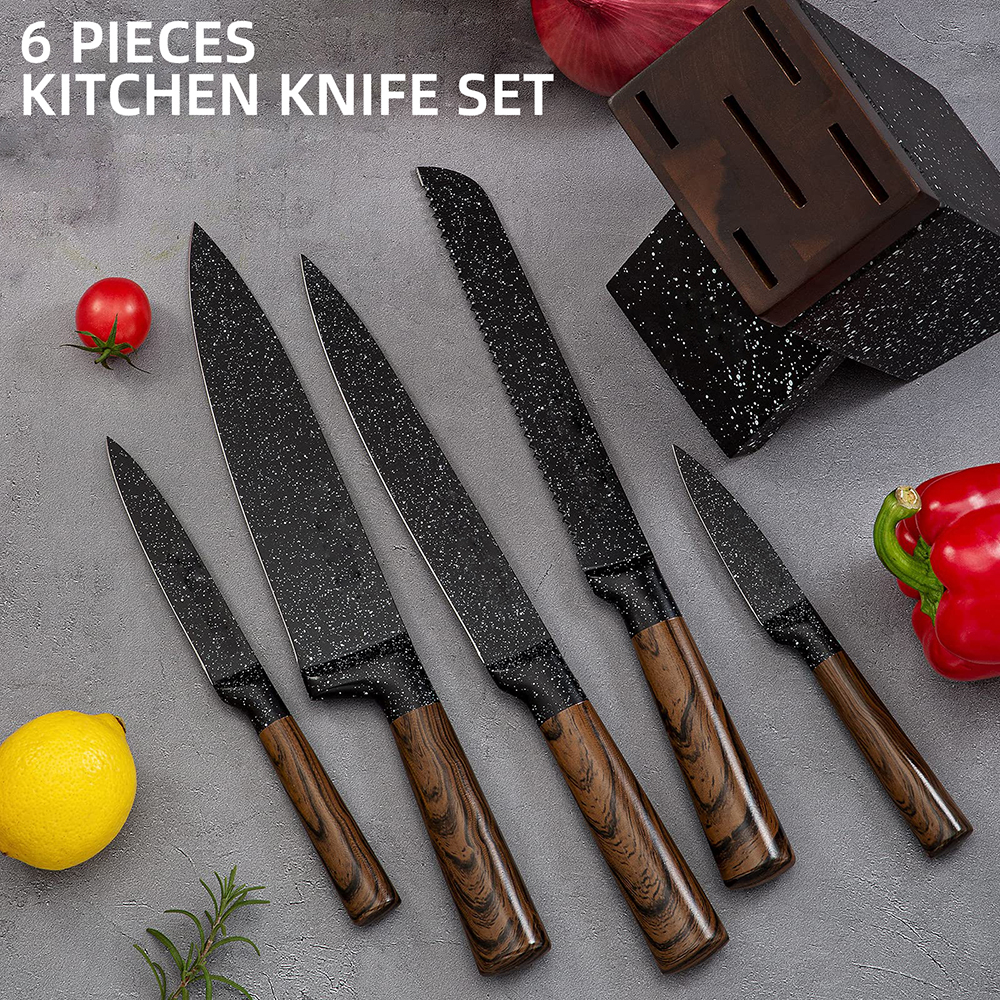 6 items include:8“Chef knife, 8″Slicer knife, 8”Bread knife, 5”Utility knife, 3.5”Paring knife,Acacia wooden block